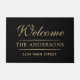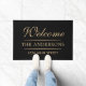 Modern & elegant custom doormat. This Design features tan text "Welcome" in calligraphy script writing with family's last name , your home's street address and simple horizontal divider line accents.