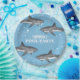 This cute design features a simple blue animal party décor, a cute pool party water ocean, with watercolor shark fish sea animal, a blue custom paper party plate, a cocktail tableware, table dinner dessert plate, with wild wildlife nautical marine life, with sharks fish marine grey black, a fun whimsical festive picnic invite, great for summer fun swimming swim party, for backyard summer party supplies