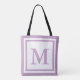 A big lilac monogram is a white background surrounded by a triple border. You can change the initial the show the appropriate monogram.