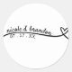 Simple black and white heart wedding round sticker with the bride and groom's name and anniversary date.