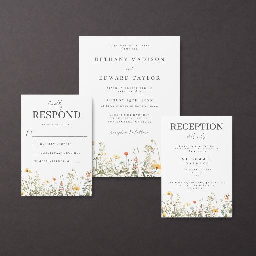 This collection features a delicate border of watercolor wildflowers. Perfect for elegant spring and summer weddings.
