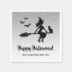 Elegant silver and black colour Halloween design featuring Destei's silhouette of a long hair witch woman flying on a broomstick. The witch is wearing a long dress, high heel shoes and a witch's hat. There are also three flying bats behind the witch and a cat sitting on the broom right in front of the witch. Behind the witch are many little stars and some bigger looking stars creating a glamourous look for this design. The background is a grey gradient allowing for all the black elements to pop. There are also two personalizable text areas.