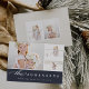 Simple and elegant holiday photo card features three photos in a collage layout, with your family name and custom message beneath in crisp white on a rich navy blue background. Add two additional photos to the back, along with additional optional custom text, on contrasting warm ivory. A beautiful minimalist choice that will make your holiday mailings stand out from the pack.