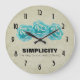 A clock with an inspirational quote which says: Simplicity the key to successful living. Illustrated with teal watercolor roses on a faded tan damask pattern.