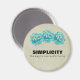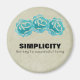 A magnet with an inspirational quote which says: Simplicity the key to successful living. Illustrated with teal watercolor roses on a faded tan damask pattern.