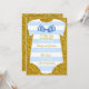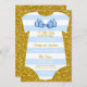 this is a super cute and simple baby shower invitation with a with blue and white unitard with stripes on a glitter background.
