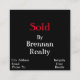 A simplistic real estate business card in black and red. Black Front with Red Text Sold , Text Below By Brennan Realty . Template fields for your Town Address Email and Mobile No .