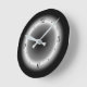 A silver white /gray circular design with a black border.This appears to be illuminated enhanced by black numerals , and gray hands .Brighten up your decor with this trendy clock! Available in round and square shapes. Note> Not a led product.