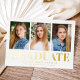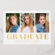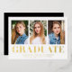 Celebrate your graduate's achievement with this stylish and modern graduation announcement, featuring three personal photos framed in crisp white with "Graduate" displayed in bold gold foil lettering. This elegant multi-photo graduation announcement allows you to customise the front with the graduate's name, school name, and graduation year for a personalised touch. Perfect for both high school and college graduates, this gold foil graduation announcement adds a sophisticated shine to your big announcement, making it a keepsake to cherish for years to come.