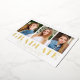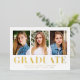 Stylish graduation party invitation featuring 3 photos framed in white with "Graduate" in bold, gold foil lettering. Personalize the front of the foil graduation party invite with the graduate's name, school name, and graduation year. The back of the invite displays your graduation party details below the phrase "let's celebrate" with a solid black background.