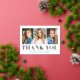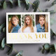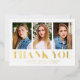 Simple graduation thank you card featuring the graduate's 3 photos on the front with "Thank You" displayed in bold gold foil lettering. Personalise the gold foil graduation thank you card by adding the graduate's name, school name, and graduation year. The back of the card provides space for your typed or handwritten thank you message.