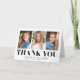 Simple graduation thank you card featuring the graduate's 3 photos on the front with "Thank You" displayed in bold black lettering. Personalise the photo graduation thank you card by adding the graduate's name, school name, and graduation year. The inside of the card provides space for your typed or handwritten thank you message.