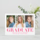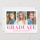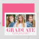 Celebrate your graduate's milestone with these minimalist graduation announcements, showcasing three of their best photos and bold hot pink "Graduate" lettering. This modern and vibrant design offers a fun and stylish way to announce their achievement. Personalise the announcement by adding the graduate's name, school name, and graduation year for a truly unique touch. Perfect for both high school and college graduates, this multi-photo design is an eye-catching and memorable way to share their success with loved ones.