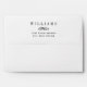 Custom wedding mailing envelopes feature a simply elegant formal style black last name and return address text that can be personalised with black scroll accent.