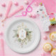 This lovely winter botanical paper plate features bouquets of ivory roses and flowers, red holly berries, fir and golden snowflakes surrounding an elegant gold label for your monogram on a pale pearl grey background. Includes editable text fields.