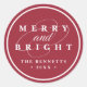Our personalised holiday seals add an elegant and festive touch to all your Christmas cards and invitations. Design features "Merry and Bright" in a chic mix of block and calligraphy script typefaces in crisp white on a festive cranberry red background. Personalise with your family name and the year beneath.