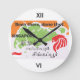 The clock did not take as long to arrive as I thought it might and was extremely well packaged. I didn't do the measurements so I didn't realize it is a little smaller than the average clock but that does not matter (just make sure you check if that's important to you).It is really nifty! It seems very solid and well made not flimsy at all. It has been going well and has kept good time in its few weeks on my wall. Nice product. Gets noticed too! Nicer in real life than the picture but true to the picture