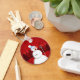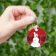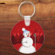 Christmas design with an illustration of a happy snowman singing with a microphone. Snow is falling, snowflakes everywhere, and a forest of pine trees can be seen in the background. This happy snowman design has cheerful white and red Christmas colour scheme with a touch of blue and orange.