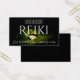 A single drop of water is nestled on a green leaf on this modern Reiki business card.