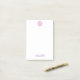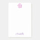This sticky note pad features a bold digital painting of a single Lavatera flower bloom at the top of the page and a purple personalised name at the bottom edge in a scripted font.