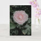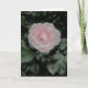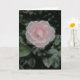 A single light pink rose against dark green foliage on the front of the card and the words Happy Anniversary inside.