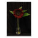 This elegant note card features a lovely single red sunflower in a simple vase with a few green leaves set against a black velvet background. Inside is one tiny flower on a pale pink gradient.