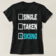 Introducing the "Single Taken Skiing Skier Winter Snow Sports" T-shirt – a perfect blend of style and passion for those who live and breathe the thrill of winter sports. This unique design features a bold checklist that speaks directly to the adventurous spirit of skiers and snowboarders alike. The words "Single" and "Taken" stand out in clean white, showcasing a sense of humor while delineating the wearer's relationship status. The third box, labeled "Skiing," is proudly checked, symbolizing the wearer's commitment to their favorite winter pastime.