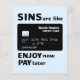 Sins are like Credit Cards, this funny christian design features a credit card silhouette with text saying " Sins are like Credit Cards, Enjoy Now Pay Later".