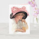 Young woman sipping a soda drink while wearing a big black hat with large pink bow. A delightful vintage scene.