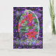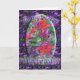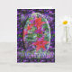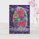 Background is repeated iris pattern, with almost stained glass appearance and intense colour. Focal point is red-orange lilies in oval shape blended with backgrouond. Text reads, "To my sister on her birthday."