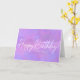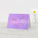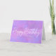 Modern and simple but very girly and feminine purple and white card. Happy Birthday is written in a bright white calligraphy script. It really pops against a bright purple abstract background.