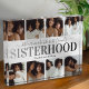 Personalised sister photo block featuring a 8 photo collage template, the word 'sisters make the best friends', the word 'sisterhood' in a black/grey gradient font, and your names.