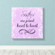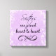 Sisters Quote Heart to Heart Canvas Prints. Purple background with bokeh edge accents and vintage double hearts scroll frame this inspirational Sister quote, 'Sisters are joined heart to heart'.