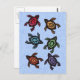 This postcard is light blue with six colourful turtles with abstract markings on their black shells in colours of blue, red, yellow, green, purple, and orange.