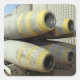 Six GBU-12 bombs sit in a rack inside a weapons storage area.