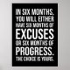 Unlock an extra dose of inspiration every time you glance at our captivating "Six Months of Excuses or Progress" motivational poster. Perfect for anyone dedicated to personal growth, whether you're an entrepreneur, a fitness enthusiast, or simply seeking some daily motivation. Designed in a stylish and modern black and white color scheme, this poster seamlessly complements any space, from a bustling office to a tranquil home gym area.