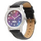 A watch with a cool pattern with a sixties vibes. Rainbow coloured circles and swirls.