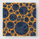 A vibrant pattern showcases a series of interconnected dark blue circles set against a bright orange background, creating a striking contrast. The overlapping arrangement gives a sense of depth and movement. Illustration design of trippy abstract orange and blue lava slime holes. Tags: abstract, dots, geometric, crazy, orange, blue, hallucinogenic, holes, psychedelic, lava, trippy, trypophobia