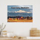 Skagit Valley is known for its farmlands, views of Mount Baker and other Cascade Mountains, a world-renowned tulip festival, and migrating snow geese. This bucolic but dramatic poster captures the shadows of clouds dancing on Mount Baker above red farmhouses and golden grasses. It was taken from Fir Island Farms, a lovely natural refuge in Mount Vernon where birders and photographers take photos of eagles, harriers, geese, and swans. The text "Skagit Valley, Washington" is written across the top in dark brown lettering. This travel poster is derived from an original photo with posterization effects applied.