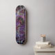 Skate board with an abstract purple design on a black background. Check it out.