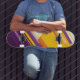 Skateboard shown in a multi purple and gold colours abstract graphic print.