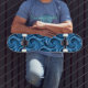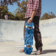 Skateboard is shown in a artful blue colour swirl abstract print.