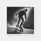 A skateboarder is captured in mid-action, gliding on a board while lightning bolts illuminate the night sky behind him
