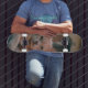 The skateboard has a specific design, depicting the image of an orange-colored cat. This cat has a serious attitude, suggesting that the graphic representation of the cat on the skateboard conveys a facial expression or posture that denotes seriousness. The combination of the stratified cat's appearance and the choice of orange color gives a striking and distinctive look to the skateboard, making it a unique piece with a touch of feline personality.