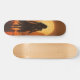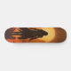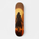 The skateboard has a specific design, which highlights the silhouette of a warrior woman. This design is set in a dawn stage, suggesting the image of the warrior in a moment of strength and determination. The skateboard, in addition to being a means of transport, serves as a canvas to express this artistic concept that incorporates the female figure in a context of strength and bravery. The combination of the silhouette of women warriors and the atmosphere of dawn could convey a symbolic message related to energy, empowerment, or struggle.