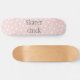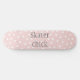 NewParkLane - Skateboard, with a cute pattern of hand drawn little white hearts, against a blush pink background, with "Skater Chick' slogan in fun grey typography. A cute design for a girls!