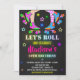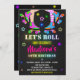 Rolling neon colours theme birthday invitation for a skater girl birthday featuring a pair of legs wearing skates and some stars around.