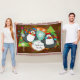 Beautiful Christmas holiday throw blanket features two adorable penguins in ice skates, striped scarves, and winter hats and two decorated Christmas trees on a background of brown, with colourful snowflakes, a ring of solid orange with white snowflakes, and a centre of aqua blue with little white polka dots. You can easily customise this festive holiday tree skirt with your family name!