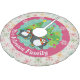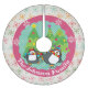 Beautiful Christmas holiday tree skirt features two adorable penguins in ice skates, striped scarves, and winter hats and three decorated Christmas trees on a background of white with various colour snowflakes, a solid pink area with white snowflakes, and an aqua blue centre with white polka dots. You can easily personalise with your family name!