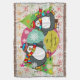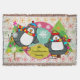 Beautiful Christmas holiday throw blanket features two adorable penguins in ice skates, striped scarves, and winter hats and decorated Christmas trees on a background of white with various colour snowflakes, a solid pink area with white snowflakes, and an aqua blue centre with white polka dots. You can easily personalise with your family name!